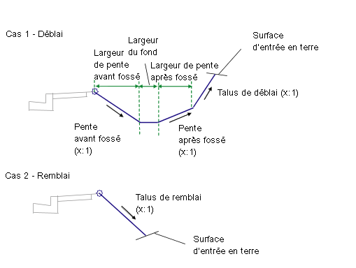 Condition de déblai uniquement - bord intérieur du fossé Condition de remblai uniquement - point d'entrée en terre |