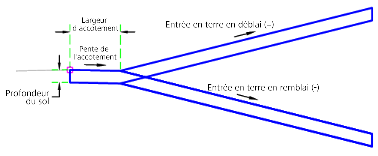 Le point d'association se situe sur le bord intérieur de la pente de déblai ou de remblai initiale. Le composant peut être attaché au côté droit ou au côté gauche.
