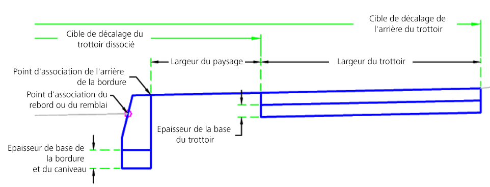| Décalage du trottoir dissocié | Permet de remplacer le paramètre de largeur fixe du trottoir et de verrouiller le bord intérieur du trottoir sur un axe de décalage. Les types d'objet suivants peuvent être utilisés comme cibles pour indiquer la largeur : axes, polylignes, lignes caractéristiques du terrain ou figures de topographie. | Facultatif |
