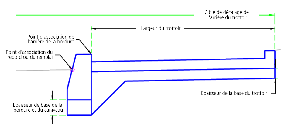 | Décalage de l'arrière du trottoir | Permet de remplacer le paramètre de largeur fixe du trottoir et de verrouiller le bord extérieur du trottoir sur un axe de décalage. Les types d'objet suivants peuvent être utilisés comme cibles pour indiquer la largeur : axes, polylignes, lignes caractéristiques du terrain ou figures de topographie. | Facultatif |