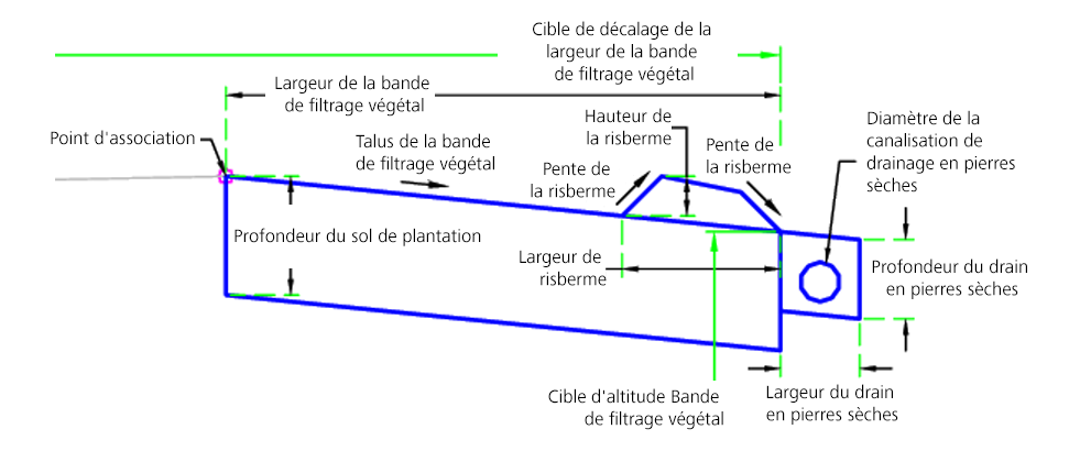 En commençant au point d'association, une surface finie et une couche de forme parallèle sont insérées en utilisant la largeur et la profondeur spécifiées. Les liens verticaux ferment la forme à l'une des extrémités de la bande de filtrage végétal. Une risberme peut également être créée à l'extrémité de la bande de filtrage végétal. Un drain en pierres sèches peut être créé à l'extrémité de la bande de filtrage végétal.