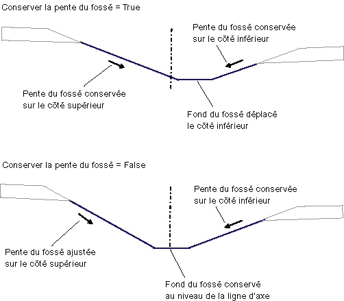 Le haut des pentes du fossé peut se situer à des altitudes différentes sur les côtés droit et gauche, créant un fossé asymétrique. Deux options sont disponibles pour remédier à cette situation. Si la fonction Conserver la pente du fossé est définie sur True, les valeurs Pente 1 et Pente 2 sont conservées des deux côtés, déplaçant le fond du fossé loin de la ligne d'axe vers le côté inférieur. Si cette fonction est définie sur False, le fond du fossé est centré par rapport au décalage du milieu entre les sommets des pentes, la pente spécifiée est conservée sur le côté inférieur et s'ajuste pour correspondre au côté supérieur.