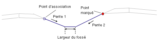 Les emplacements du point d'association et du point marqué sont déterminés. Le point marqué peut être situé à droite ou à gauche du point d'association. Les liens se prolongent vers l'intérieur depuis le point d'association sur Pente 1 et à partir du point marqué sur Pente 2 jusqu'à leur intersection. Pour une largeur de fossé spécifiée, un lien horizontal est utilisé pour le fond du fossé afin de s'ajuster à l'intersection des pentes du talus.