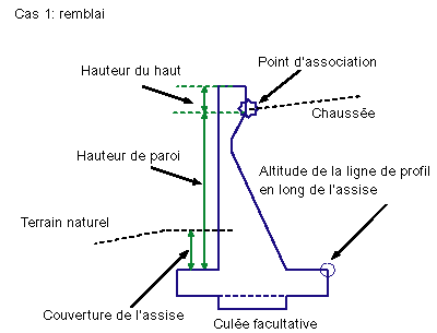 Le point d'association est différent selon que le mur de soutènement est en remblai ou en déblai. S'il est en remblai, le point d'association se situe près du haut du mur de soutènement. S'il est en déblai, le point d'association se situe près de l'assise.