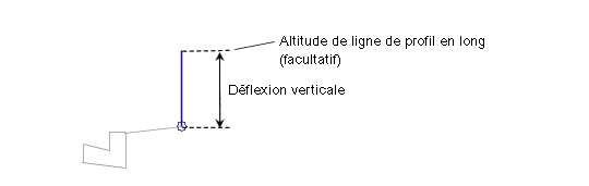 Un lien vertical est ajouté à partir du point d'association pour la déflexion verticale spécifiée. Si un nom de ligne de profil en long est spécifié pour la Déflexion verticale, l'extrémité du lien correspond à l'altitude de la ligne de profil en long.