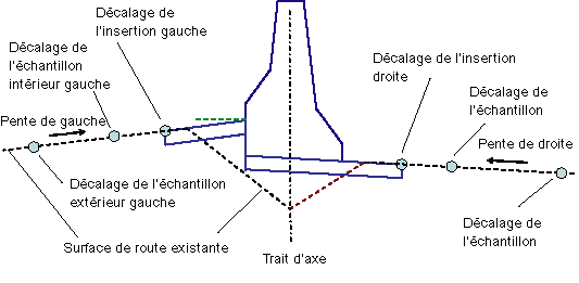 Peut être utilisé pour calculer le décalage du point d'échantillonnage extérieur gauche par rapport à un axe. Les types d'objet suivants peuvent être utilisés comme cibles pour indiquer ce décalage : axes, polylignes, lignes caractéristiques du terrain ou figures de topographie. |