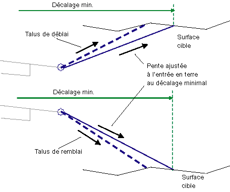 Cet élément de profil type tente de calculer un point d'entrée en terre pour la condition de déblai. Si un point d'entrée en terre est trouvé, son décalage est comparé à la valeur Décalage min. Si le point d'entrée en terre est en deçà de la valeur Décalage min., le point d'entrée en terre est déplacé vers le point de décalage minimum sur la surface cible. Si aucun point d'entrée en terre de déblai n'est trouvé, le processus est répété pour la condition de remblai.