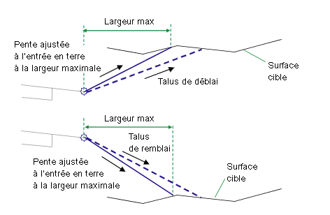 Si nécessaire, la pente est ajustée pour conserver le point d'entrée en terre avec une largeur maximum depuis le point de charnière.