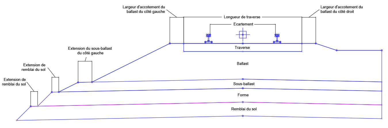 En mode d'édition, cet élément de profil type affiche les liens comprenant les rails, la traverse, le ballast, le sous-ballast et les pentes de talus.