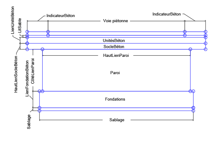 L'élément de profil type Quai_Double inclut des couches courantes pour un quai double telles que les parois, les socles en béton, les voies piétonnes, les lits de sable et les fondations.
