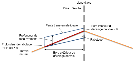 Remarque : Si l'option Dévers de la voie intérieure/extérieure est sélectionnée, mais qu'aucune table de dévers n'est définie pour l'axe du projet 3D, la pente transversale idéale sera utilisée à la place.