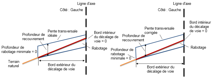 La valeur du dévers de la voie extérieure ou intérieure remplacera celle de la pente transversale idéale. Les valeurs de la pente transversale corrigée de la couche de recouvrement seront définies sur la base de la table de dévers de la ligne de profil en travers et non en fonction de la pente transversale idéale.