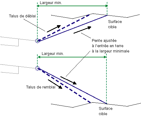 Cet élément de profil type tente de calculer un point d'entrée en terre pour la condition de déblai. Si un point d'entrée en terre est trouvé, la largeur du lien d'entrée en terre est comparée à la valeur Largeur min. Si le point d'entrée en terre est en deçà de la valeur Largeur min., le point d'entrée en terre est déplacé vers le point de largeur minimum sur la surface cible. Si aucun point d'entrée en terre de déblai n'est trouvé, le processus est répété pour la condition de remblai.