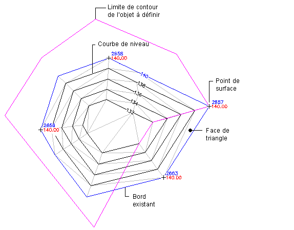 Les limites de contour sont des polylignes fermées qui affectent la visibilité des triangles à l'intérieur ou à l'extérieur des polylignes. La limite de contour extérieure détermine l'étendue de la surface. Tous les triangles situés à l'intérieur de la limite de contour sont visibles et les triangles situés à l'extérieur sont invisibles.