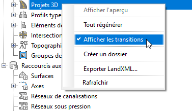 - Nous avons ajouté une fonctionnalité de mise en surbrillance des transitions dans les projets 3D. Cliquez avec le bouton droit de la souris sur l’ensemble Projets 3D dans l’arborescence du prospecteur, puis cliquez sur Afficher les transitions. Cette commande vous permet de passer rapidement en revue toutes les transitions dans le dessin.