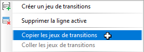 - Il est désormais possible de copier et de coller des jeux de transitions. Vous pouvez copier vos jeux de transitions pour les coller dans le même projet 3D (que ce soit sur la même ligne de base ou non), ou dans d’autres projets 3D et dessins.