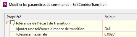 Lors de la modification de coupes de projet 3D dans la vue Éditeur de paramètres de projet 3D, les valeurs des paramètres au niveau des abscisses curvilignes qui présentent des conflits avec les transitions de projet 3D sont désormais en lecture seule. Lorsque vous placez le curseur sur une valeur en lecture seule, une info-bulle s’affiche pour vous indiquer que la valeur est remplacée par une transition de projet 3D.