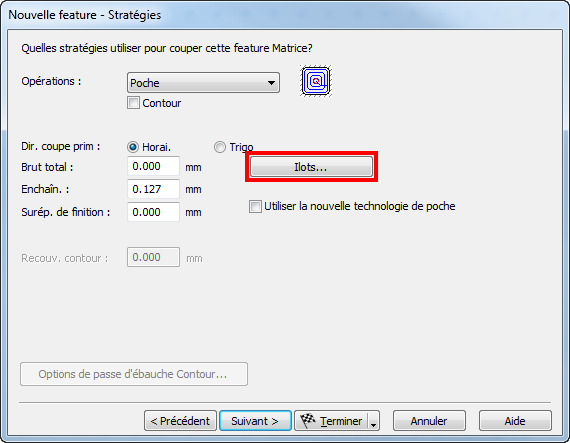 Quand vous sélectionnez soit Poche, soit Zigzag comme étant l'opération sur la page de stratégies de l'assistant de nouvelle feature (ou dans l'onglet Stratégie de la boite de dialogue des propriétés de la feature), vous verrez un bouton appelé Ilots.