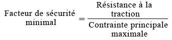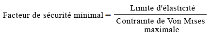 Le facteur de sécurité correspond au rapport entre la contrainte maximale autorisée et la contrainte équivalente (Von Mises), lors de l'utilisation de la limite d'élasticité. Il doit être supérieur à 1 pour que la conception soit acceptable. (Un facteur inférieur à 1 indique une déformation permanente.) Avec la résistance à la rupture, les rapports de facteurs de sécurité sont déterminés par la contrainte principale maximale.