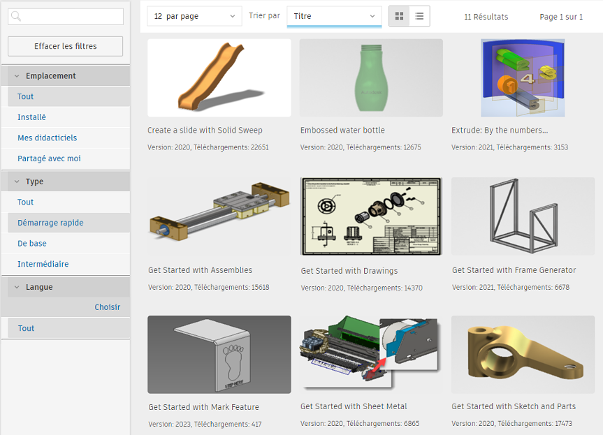 Définissez le filtre Type sur Démarrage rapide pour consulter les didacticiels qui présentent les bases de la création d’esquisse, de la modélisation de pièces, de la création d’ensembles et de la documentation de vos conceptions dans un dessin.