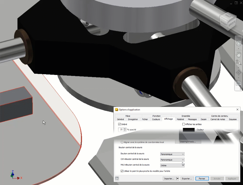Une nouvelle option d’application a été ajoutée pour permettre de contrôler le point de pivotement en effectuant une mise en orbite du modèle dans la zone de dessin. Lorsque cette option n’est pas sélectionnée, c’est l’ancien comportement de mise en orbite qui est appliqué.