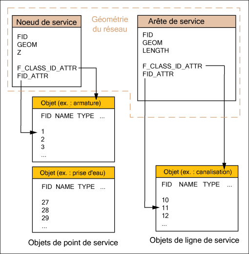 Un modèle de données de service est constitué de noeuds et d'arêtes stockés dans deux classes d'objets géométrie et de données d'attributs stockées dans des classes d'objets attribut. Chaque objet de service est décrit par un objet de géométrie, qui n'a aucun attribut spécifique (et ne doit pas être amélioré), et ses objets attributs associés. Cela signifie que le type de noeud est déterminé par l'objet attribut associé.
