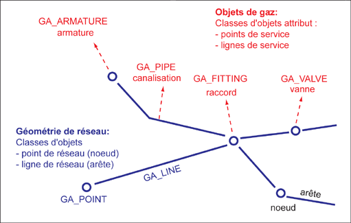 Les objets gaz sont stockés dans les classes d'objets attribut GA_POINT.FID_ATTR (points de service) et GA_LINE.FID_ATTR (lignes de service). Ils sont liés aux classes d'objets de géométrie point ou ligne associées. |