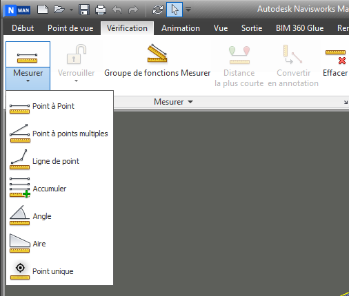 Ces outils permettent d'effectuer des mesures entre différents points des éléments du modèle. Toutes les mesures sont exprimées dans les unités d'affichage. Les outils de mesure sont disponibles dans l'onglet Vérification le groupe de fonctions > Mesurer.