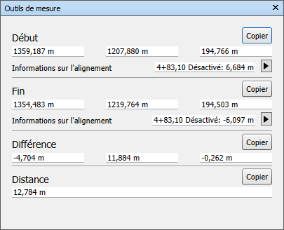 Quelles que soient les mesures effectuées, les coordonnées X, Y et Z du point de départ et du point d'arrivée ainsi que les valeurs correspondant à la différence et à la distance absolue sont indiquées dans les zones de texte. Si vous effectuez des mesures cumulées (du type Ligne à base de points ou Mesure cumulée), la zone Distance présente la distance cumulée pour tous les points enregistrés dans la mesure.