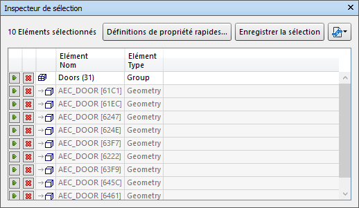 Vous pouvez inspecter une sélection dans l'arborescence de sélection ou dans la vue de la scène. Vous pouvez également cliquer sur un jeu de sélection ou de recherche. Vous pouvez effectuer un zoom sur la sélection pour l'afficher dans le modèle ou la modifier en désélectionnant les objets et en ajoutant des définitions de propriété.