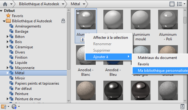 Dans l'onglet Matériaux, cliquez avec le bouton droit de la souris sur le témoin de matériau > Ajouter à > nom de la bibliothèque à laquelle vous souhaitez ajouter le matériau. En l'absence d'une bibliothèque personnalisée, vous devez la créer en premier lieu.