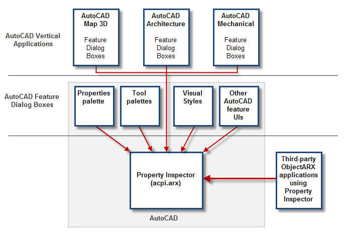 AutoCAD-based vertical applications that use AutoCAD as their development platform may also use the Property Inspector. AutoCAD Architecture and AutoCAD Map 3D toolsets implement the Property Inspector in some of their feature UIs. External third-party applications can likewise access and implement the Property Inspector.