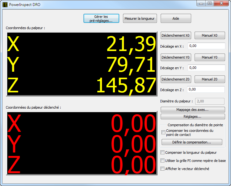 Remarque : PowerInspect DRO ne supporte que les appareils de mesure qui incluent une capacité de suivi de point. Sans cette fonctionnalité, il peut uniquement définir l'emplacement des points déclenchés. Il est disponible uniquement en vue d'une utilisation avec des machines CNC et manuelles.