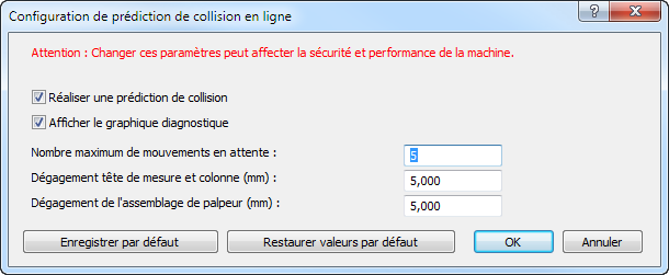 - Dans la case Dégagement tête de mesure et colonne, entrez la distance entre les palpeurs à laquelle un avertissement de proximité est donné.