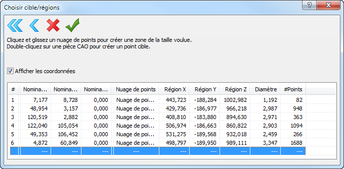 La boite de dialogue Choisir cible/régions est affichée quand vous cliquez sur Ajouter ou sur Modifier dans la boite de dialogue Dégauchissage points-choisis de nuage de points. Utilisez cette boite de dialogue pour faire correspondre le modèle CAO aux régions dans les nuages de points quand vous créez un dégauchissage points-choisis de nuage de points. Par exemple :