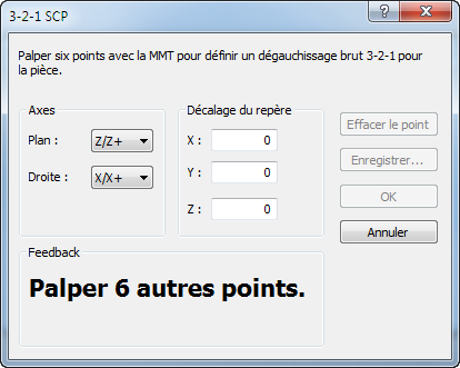 Quand vous prenez chaque point, la zone Feedback affiche le nombre de points restant. Lorsque les six points sont pris, la zone affiche : Six points reçus. Matrice mise à jour pour indiquer que le dégauchissage initial a été créé.