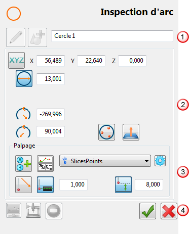 Paramètres — Spécifie les paramètres sélectionnés pour l'élément, tels que les valeurs nominales, les angles de départ et de fin et si la forme doit être palpée à l'intérieur ou à l'extérieur. Les paramètres affichés dépendent du type d'élément que vous sélectionnez.