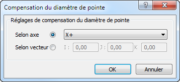 Par défaut, DRO affiche les coordonnées du centre du palpeur. Utilisez cette boite de dialogue pour spécifier la direction de compensation si vous avez coché la case Compenser les coordonnées du point de contact.