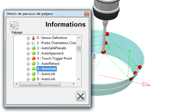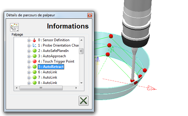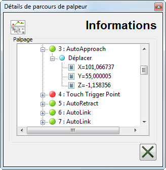 . La boite de dialogue Détails de parcours de palpeur s'affiche.Si vous voulez voir plus de détails à propos d'un mouvement, cliquez sur