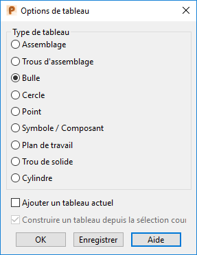 - Sélectionnez l'option Type de tableau dans la boite de dialogue qui correspond aux éléments que vous avez sélectionné. Choisissez parmi :