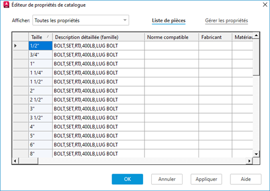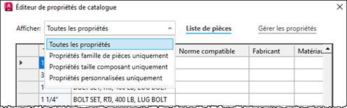 Affiche les propriétés et les pièces d’une famille de pièces et configure la priorité d’utilisation des pièces en fonction de leur taille.
