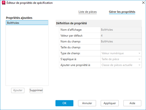 Ajoute de nouvelles propriétés et spécifie des définitions de propriétés pour la sélection courante ou pour un groupe de pièces sélectionné.