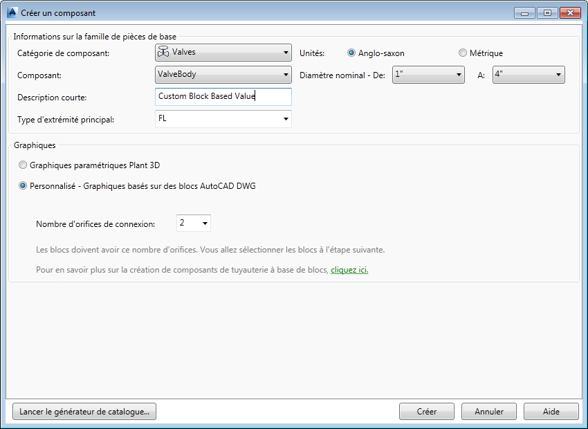 Spécifie une plage de diamètres nominaux à ajouter à la liste. Une fois que des diamètres nominaux ont été ajoutés, vous pouvez importer une géométrie personnalisée et spécifier des propriétés d'orifice.