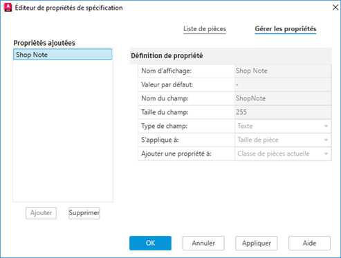 Ajoute des nouvelles propriétés et spécifie des définitions de propriétés pour la sélection courante ou pour toutes les pièces d’une spécification des tuyauteries.