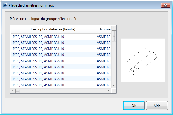 Affiche tous les diamètres nominaux d'un groupe de pièces (famille de pièces) lors de la consultation du catalogue dans Spec Editor.
