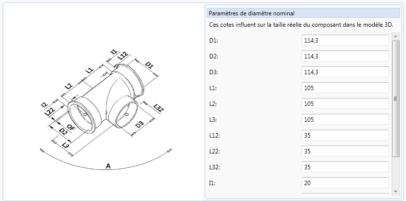 L'image suivante montre un té fileté femelle Plant 3D dans l'éditeur de catalogues (onglet diamètre nominal).