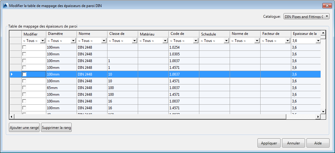 Modifie les valeurs de la table de mappage des épaisseurs de paroi pour les pièces de catalogue DIN. Les valeurs de propriété définies dans la table sont mises en correspondance avec une épaisseur de paroi. Vous pouvez utiliser la table de mappage pour attribuer une épaisseur de paroi aux pièces d'une feuille de spécification des tuyauteries.
