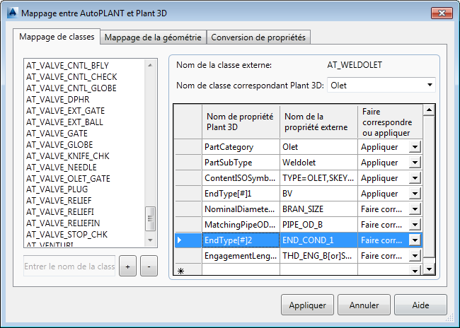 Des propriétés globales telles que la description détaillée, la classe de pression, le schedule, etc. , peuvent être mappées globalement pour toutes les classes. Les propriétés de classe individuelles, à l'inverse, sont mappées une à une avec les propriétés de classe Plant 3D correspondantes.