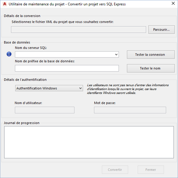 - Ces champs ne sont actifs que si l'option Authentification SQL Server est sélectionnée. Entrez vos nom d'utilisateur et mot de passe SQL Server pour continuer.