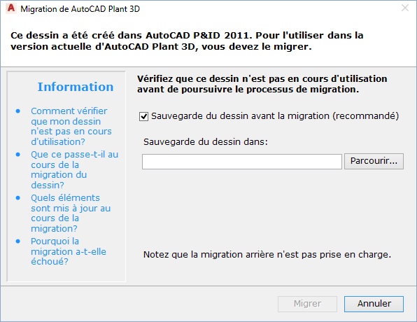 Lorsque vous tentez d'ajouter un dessin créé dans une version antérieure à un projet créé dans la version actuelle, l'assistant de migration de dessin s'ouvre. La migration porte uniquement sur le dessin que vous ajoutez au projet. Vous pouvez créer une copie de sauvegarde au cours de la migration, au cas où le dessin devrait être retravaillé dans la version antérieure. Si vous annulez la migration, le dessin revient à son état d'origine.
